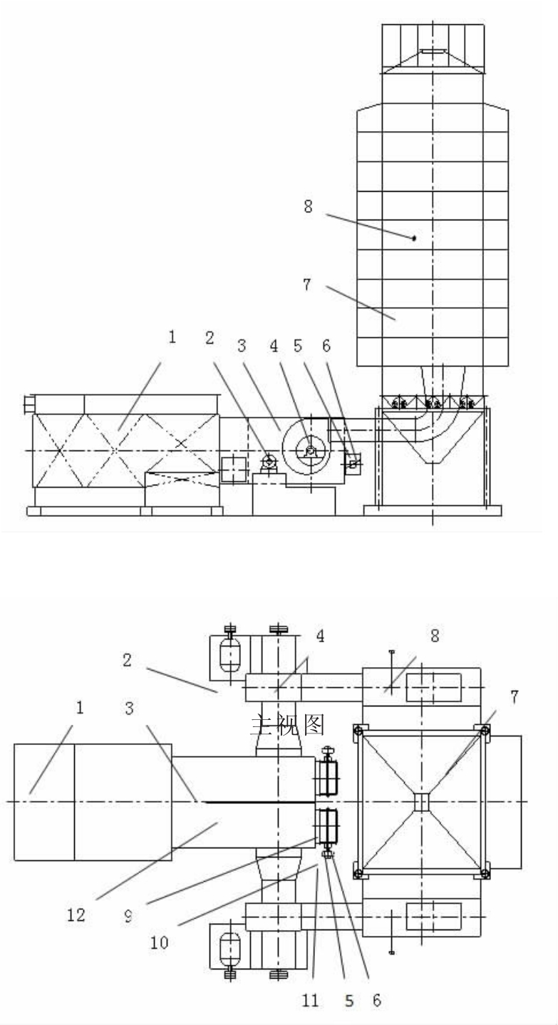 1.熱交換器;2.電機;3.混合室;4.主風機;5.調風筒;6.風門板;7.種子干燥機;8.溫度傳感器;9.閥門軸;10.聯軸器;11.電動執行器;俯12視.混圖合室中間隔板